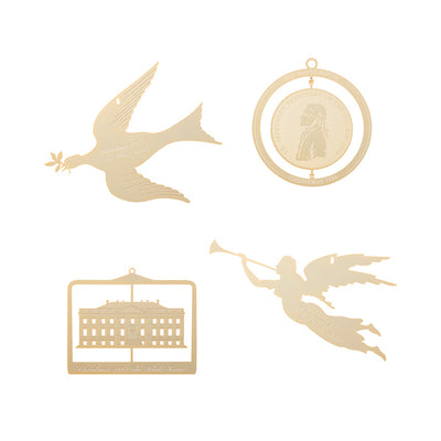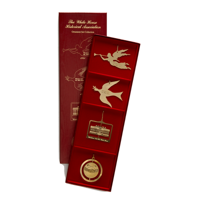 This set includes the first four White House Christmas ornaments (no longer sold individually). 1981 Angel in Flight, The First White House Ornament. 1982 Dove of Peace, honoring George Washington, First President of the United States, 1789–97. A faithful miniature replica of the dove of peace weathervane that Washington commissioned for his home at Mount Vernon. 1983 The White House, Honoring John Adams, Second President of the United States, 1797–1801. Adams was the first president to live in the White House and the ornament depicts the north facade of the house as he would have known it, before the addition of the columned portico so familiar to us today. 1984 The Jefferson Peace Medal, honoring Thomas Jefferson, third President of the United States, 1801–09. The design is based upon the historic Jefferson peace medal, minted in 1801. President Jefferson's portrait is featured on one side and the opposite side shows the clasped hands of an Indian and a soldier, crowned by a tomahawk and a pipe of peace. Each original White House Christmas ornament is finished in 24-karat gold. The 1981-1984 ornament set is packaged with four brochures: one for each ornament describing the inspiration for its design and relevant historical background.