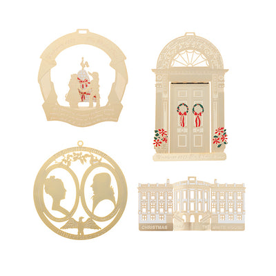 Each ornament is finished in 24-karat gold. The set is packaged with four brochures: one for each ornament describing the inspiration for its design and relevant historical background information.