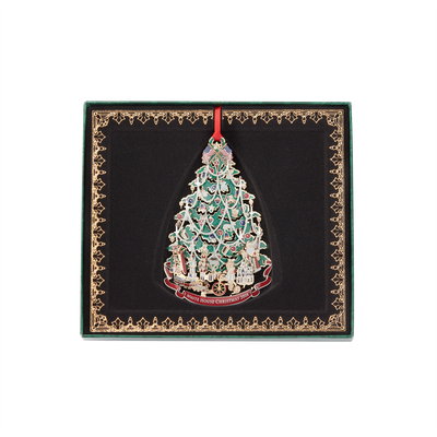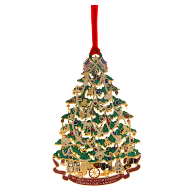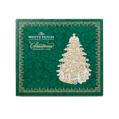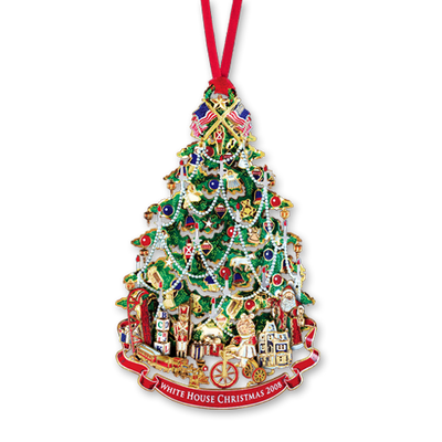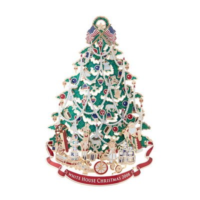 "We shall have an old-fashioned Christmas Tree for the grandchildren upstairs, and I shall be their Santa Claus myself." - President Benjamin Harrison. The 2008 White House Christmas ornament honors the administration of President Benjamin Harrison. Serving one term from 1889 to 1893, Harrison was a centennial president inaugurated 100 years after George Washington. Inspired by the Harrison family's Victorian Christmas tree, this 24 karat gold finished White House Christmas ornament for 2008 interprets the first recorded tree to decorate the White House. The tree, laden with baubles and garland, is a canvas for all sorts of treats and toys. Beneath the tree are the presents the Harrison grandchildren received: a toy train and a wooden sled await Benjamin, Mary's rosy-cheeked doll sits on a tricycle, and nearby is Marthena's much wished for dollhouse. A three-foot-high Santa Claus completes the season's spectacle.