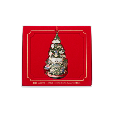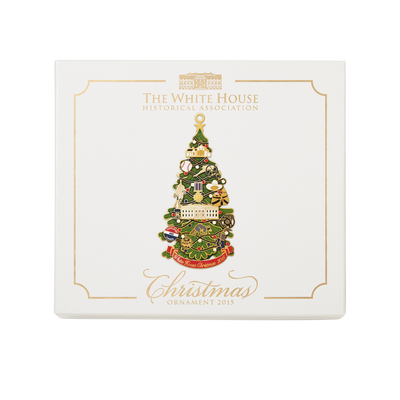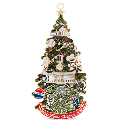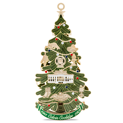 The 2015 White House Christmas ornament honors the administration of Calvin Coolidge, who served as the thirtieth president of the United States from 1923 to 1929. A depiction of the first National Christmas tree crafted from shiny brass plated with nickel and 24k gold is illuminated from within and hung with ornaments representing the events of Coolidge’s unique life and presidency. Both the north and south facades of the White House are included in the ornament design. In total 14 individual ornaments are included on the tree which is topped with a star similar in design to the first National Christmas Tree.