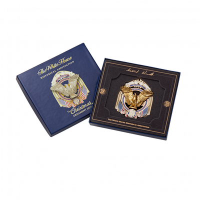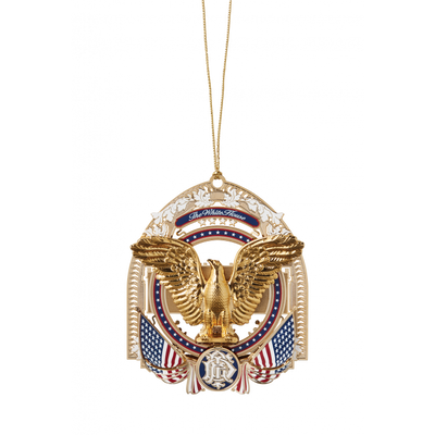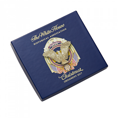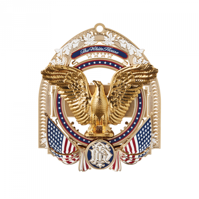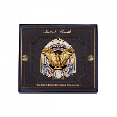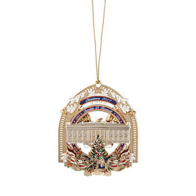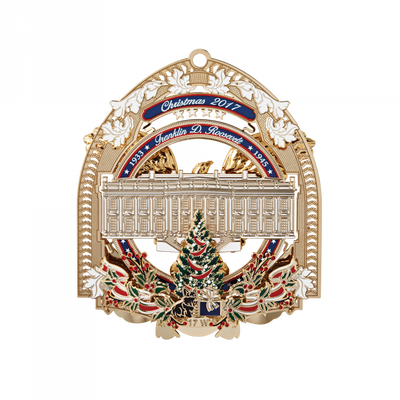 The Official 2017 White House Christmas ornament honors the administration of Franklin D. Roosevelt, who served as the thirty-second president of the United States from 1933 to 1945 and his remarkable journey to restore the faith of the American people. The ornament is crafted from shiny brass plated with nickel and 24-karat gold.