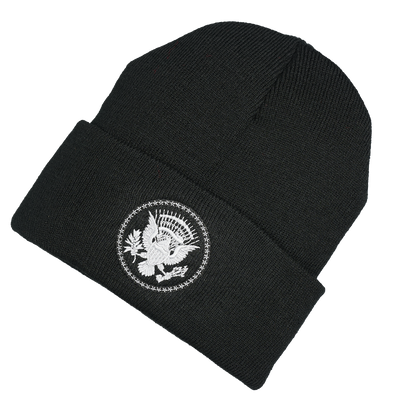 On October 25, 1945 President Harry S. Truman issued Executive Order 9646, which officially defined the Presidential Coat of Arms and Seal for the first time. An eagle’s head, which originally faced right toward a bundle of thirteen arrows held in its talons, was turned to face left toward the olive branch it held, symbolizing peace. Since 1945, the only changes made to the seal were the additions of the 49th and 50th stars. This black knit beanie features the historic Truman Seal in silver. Machine wash cold, lay flat to dry.