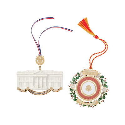 The Official 2025 White House Christmas Ornament celebrates the 150th anniversary of State Dinners at the Executive Mansion. Hand assembled, the ornament design is cut from delicate brass, etched, and printed with enamel ink and finished with 24-karat gold for the ultimate holiday shine.