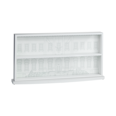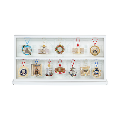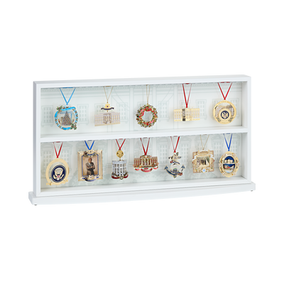 Present your collection of Official White House Christmas Ornaments in style with our first ever White House Christmas Ornament display case. Featuring a beautiful depiction of the White House North Portico entrance on acrylic backer, this elegant feature display case is durable, easy to clean, and Made in USA, just like our ornaments. The unique design allows you to display on a table or hang on a wall for friends and family to admire year round. Each case comes with 15 red satin ribbons for an exquisite presentation. Back of the fixture has thoughtful mounting slots for balanced hanging. Some assembly required. Wipe clean. Do not use abrasive cleaners.