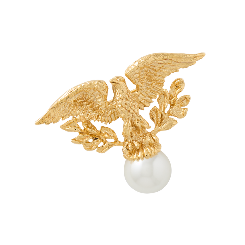 Designed by Ann Hand to honor the men and women who promote peace and better understanding of Americans around the world, this pin features the American Bald Eagle. Chosen for its great strength, majestic beauty, long lifespan, and for being native to the United States, the bald eagle became a national symbol when it was selected by Congress to appear on the Great Seal of the United States on June 20, 1782. Today the eagle is portrayed on many objects in the fine and decorative arts collection displayed throughout the White House.