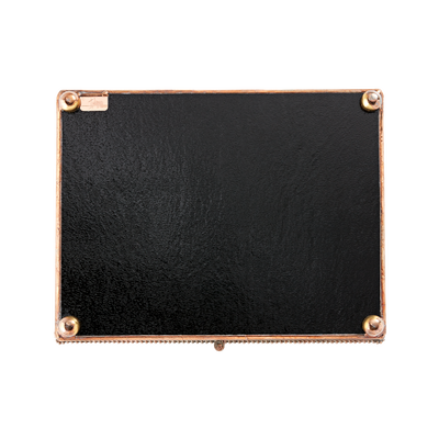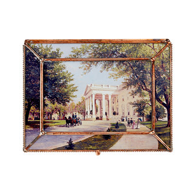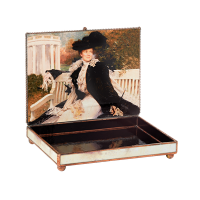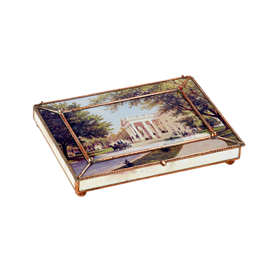The exterior of this glass decoupage box depicts a painting by artist John Ross Key. Key painted this image of the north side of the White House in 1914. Key, the grandson of Francis Scott Key, captured the bustling activity of carriages and pedestrians on the approach to the North Portico of the President's House on a bright summer day. Today the painting hangs in Blair House: The President's Guest House, just across Pennsylvania Avenue from the scene Key captured. On the interior is the Official White House portrait of First Lady Edith Roosevelt, painted by Theobald Chartran in 1902. Mrs. Roosevelt is elegantly dressed complete with hat and gloves, taking in nature on a bench on the South Lawn of the White House.