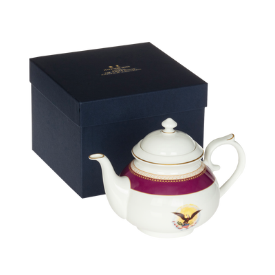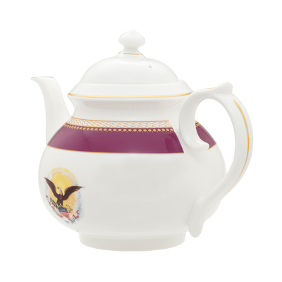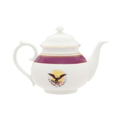 Produced exclusively for The White House Historical Association by Halcyon Days, the Lincoln Collection is inspired by President and Mrs. Abraham Lincoln's White House china service. The porcelain dinner, breakfast, dessert, and tea service was purchased for the White House by First Lady Mary Todd Lincoln during an 1861 shopping trip to the E. V. Haughwout & Co. department store in New York City. The itemized bill included with Mrs. Lincoln’s new china includes the following description of her purchase, “One fine Porcelain Dining Service . . . decorated Royal purple, and double gilt, with the Arms of the United States, on each piece.” The beautiful state service, which originally included 190 pieces, was reordered during the presidencies of Ulysses S. Grant and Chester A. Arthur and examples are kept on display in the White House China Room today. This elegant 6-cup tea pot ships in a beautiful giftbox and includes a descriptive insert about the collection. Suitable for making your perfect pot of tea or decorative display. Handwash only.