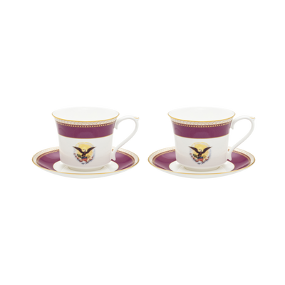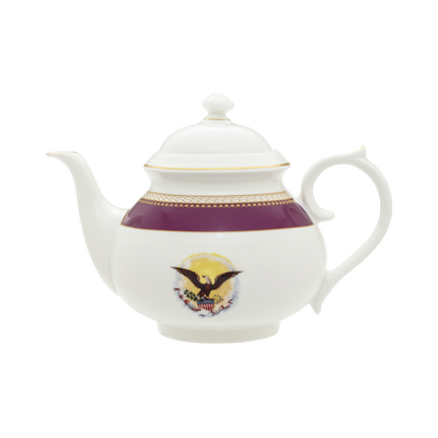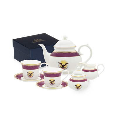 Produced exclusively for The White House Historical Association by Halcyon Days, the Lincoln Collection is inspired by President and Mrs. Abraham Lincoln's White House china service. The porcelain dinner, breakfast, dessert, and tea service was purchased for the White House by First Lady Mary Todd Lincoln during an 1861 shopping trip to the E. V. Haughwout & Co. department store in New York City. The itemized bill included with Mrs. Lincoln’s new china includes the following description of her purchase, “One fine Porcelain Dining Service . . . decorated Royal purple, and double gilt, with the Arms of the United States, on each piece.” The beautiful state service, which originally included 190 pieces, was reordered during the presidencies of Ulysses S. Grant and Chester A. Arthur and examples are kept on display in the White House China Room today. Elegantly presented as a boxed set you can pass down for generations, this tea set includes 1 - 6 cup tea pot and 2 - tea cup and saucers.