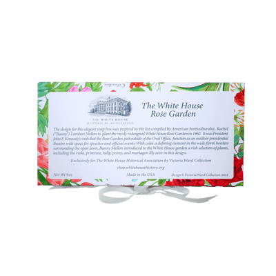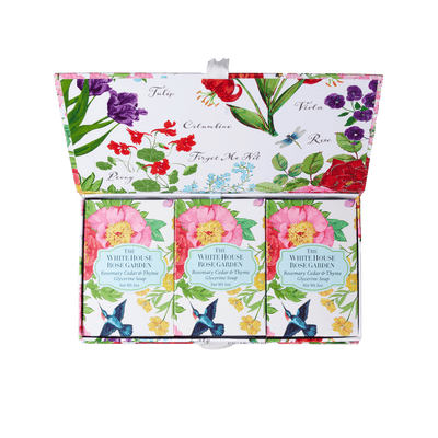 This beautifully illustrated boxed set of 3 glycerine soaps is a thoughtful gift. The design features floral drawings inspired by the list compiled by American horticulturist Rachel “Bunny” Lambert Mellon during her work with Jacqueline Kennedy to plant the newly redesigned White House Rose Garden in 1962. It was President John F. Kennedy’s wish that the Rose Garden, just outside the Oval Office, function as an outdoor presidential theater with space for speeches and official events. Soaps are Rosemary Cedar & Thyme fragrance.