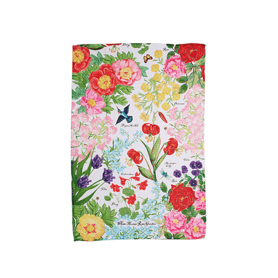 These towels are sold as a set of two. The design features floral drawings inspired by the list compiled by American horticulturist Rachel “Bunny” Lambert Mellon during her work with Jacqueline Kennedy to plant the newly redesigned White House Rose Garden in 1962. It was President John F. Kennedy’s wish that the Rose Garden, just outside the Oval Office, function as an outdoor presidential theater with space for speeches and official events. Dry clean only.