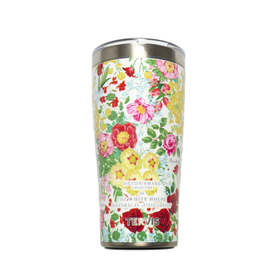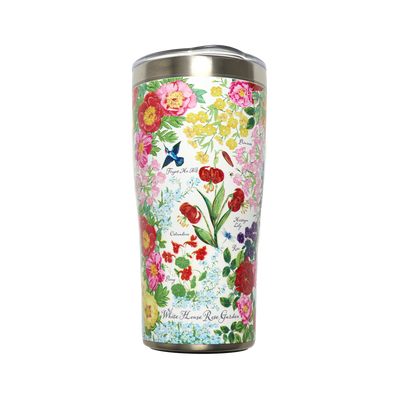 20 oz. stainless steel tumbler features floral drawings inspired by the list compiled by American horticulturalist Rachel “Bunny” Lambert Mellon during her work with Jacqueline Kennedy to plant the newly redesigned White House Rose Garden in 1962. It was President John F. Kennedy’s wish that the Rose Garden, just outside the Oval Office, function as an outdoor presidential theater with space for speeches and official events.