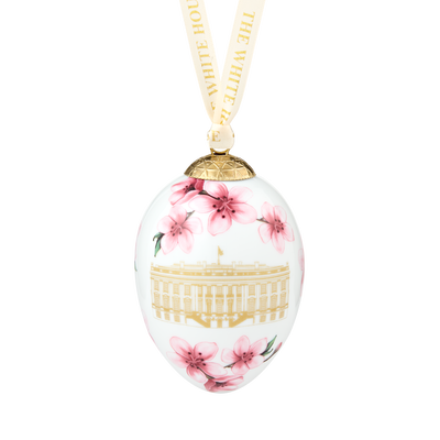 This elegant, handcrafted and beautifully hand decorated English Fine Bone china ornament is accented with a depiction of the south view of the White House surrounded by impeccably detailed watercolor cherry blossom flowers. This item arrives boxed with gold foil branded imprint, perfect for gifting.