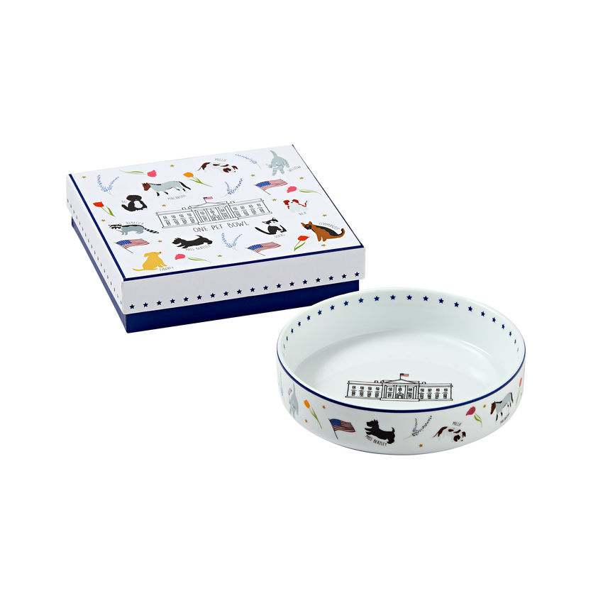 Give your pets' dinnerware a stately update with this sturdy ceramic food bowl featuring playful illustrations of popular presidential pets, including Macaroni, Caroline Kennedy’s pet pony; Socks, a stray cat adopted by Chelsea Clinton; and Miss Beazley, President George W. Bush’s Scottish terrier. The ceramic bowl is suitable for cats and small or medium-sized dogs. Not microwave or dishwasher safe.