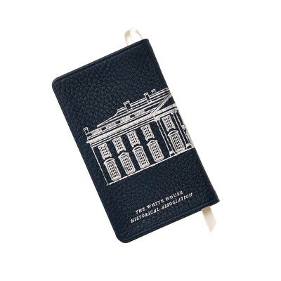 This navy blue 3 by 5 inch notebook is embossed in silver with the North Portico of the White House on textured leather. The lined pages are edged with silver and each notebook has a off-white silk ribbon book marker. The back of the notebook is embossed in silver with The White House Historical Association logo.