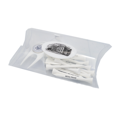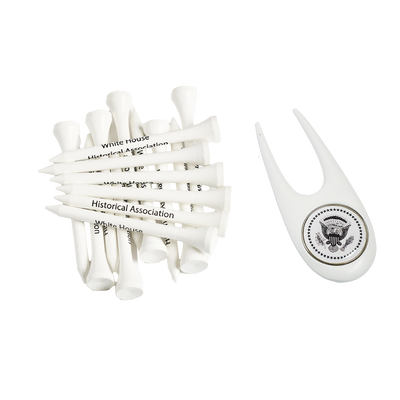 Tee off on the green with this elegant set of tees and divot tool with Truman Seal marker. Includes (15) 2 3/4 inch white wood tees and a nickel Scotsman Divot Tool with Truman Seal marker. Packaged in a plastic pillow pack.
