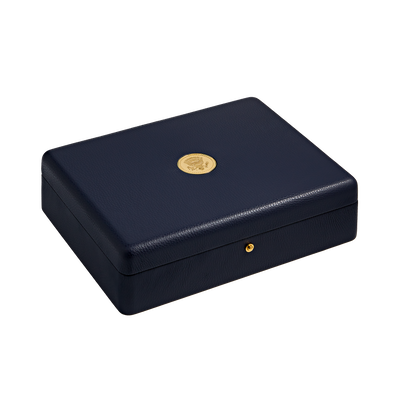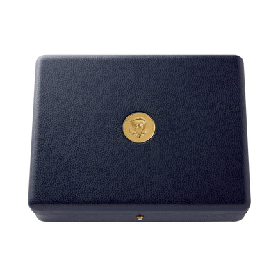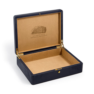 Navy leather presentation box with Truman Seal inlaid coin. On October 25, 1945, President Harry S. Truman issued Executive Order 9646, which officially defined the Presidential Coat of Arms and Seal for the first time. An eagle’s head, which originally faced right toward a bundle of thirteen arrows held in its talons, was turned to face left toward the olive branch it held, symbolizing peace. Since 1945, the only changes made to the seal were the additions of the 49th and 50th stars.