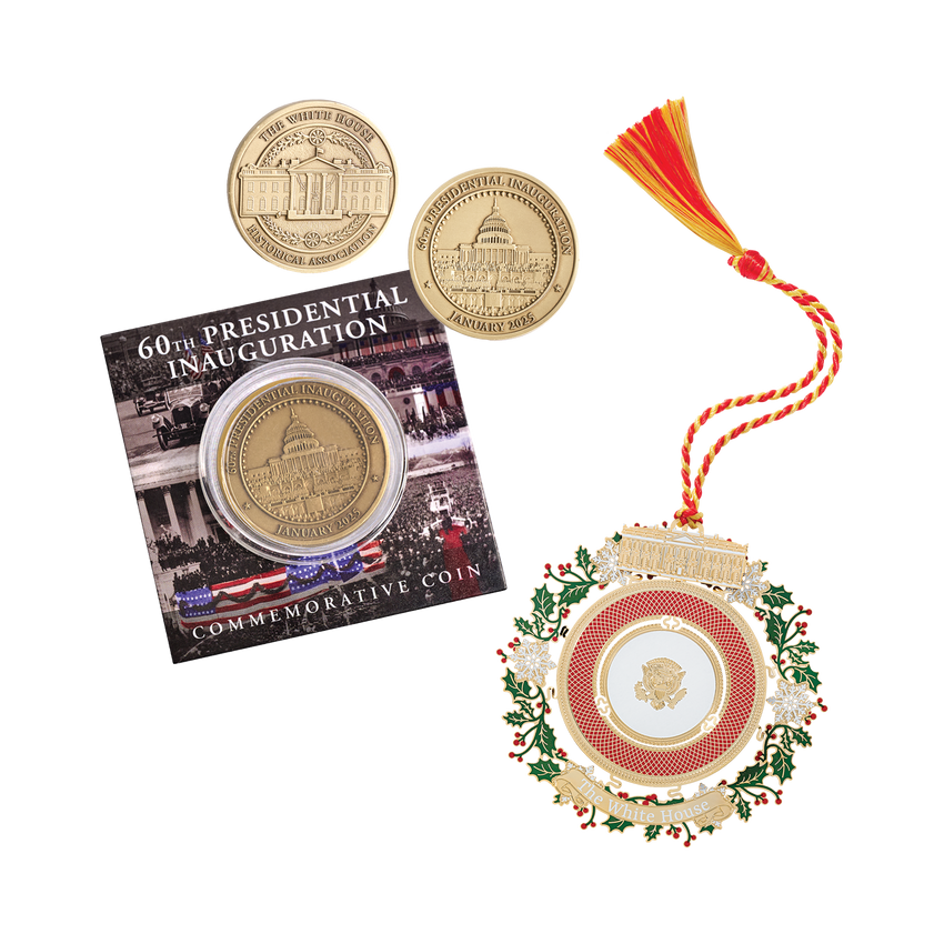 Features depictions of the West Front of the U.S. Capitol Building and White House. Comes in a plastic protective case mounted with a descriptive card that reads “60th Presidential Inauguration Commemorative Coin” at the front amidst historical Inauguration photos.