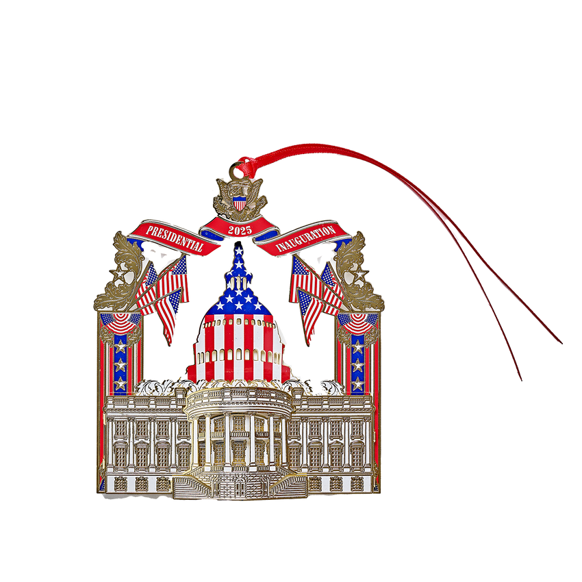 Commemorate the 60th Presidential Inauguration in 2025 with this USA made, brass ornament finished with 24K gold. Exceptionally detailed, etched designs depict a South Portico view of the White House on one side and the West Front of the U.S. Capitol Building on the opposite side. Adorned with USA flags and stars, this ornament also features headline text "2025 Presidential Inauguration".