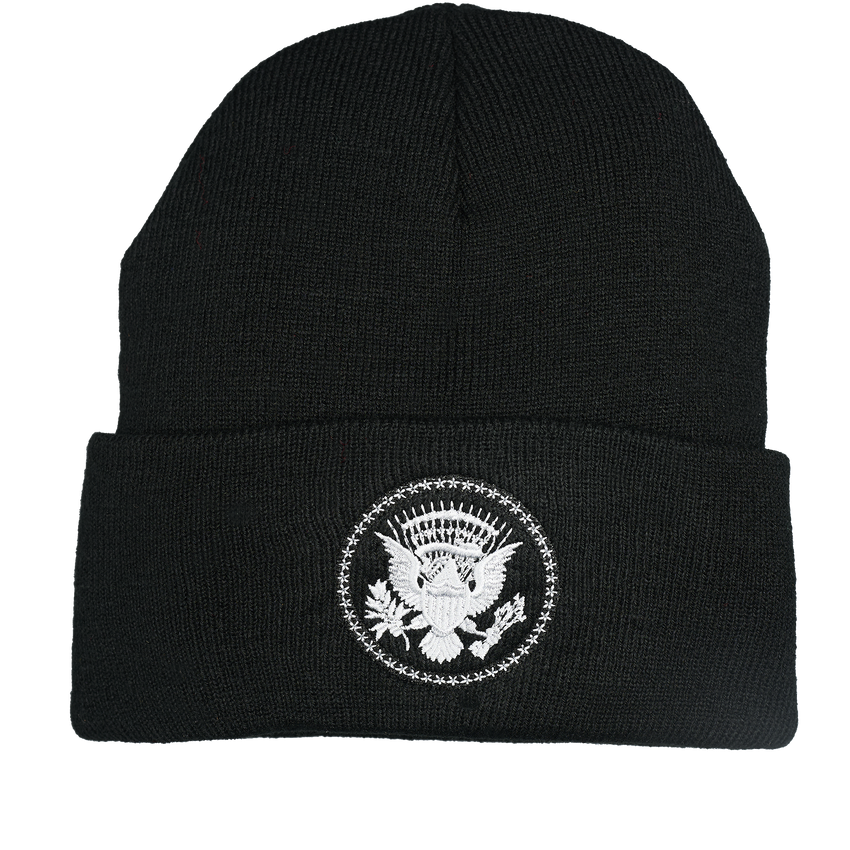 On October 25, 1945 President Harry S. Truman issued Executive Order 9646, which officially defined the Presidential Coat of Arms and Seal for the first time. An eagle’s head, which originally faced right toward a bundle of thirteen arrows held in its talons, was turned to face left toward the olive branch it held, symbolizing peace. Since 1945, the only changes made to the seal were the additions of the 49th and 50th stars. This black knit beanie features the historic Truman Seal in silver. Machine wash cold, lay flat to dry.