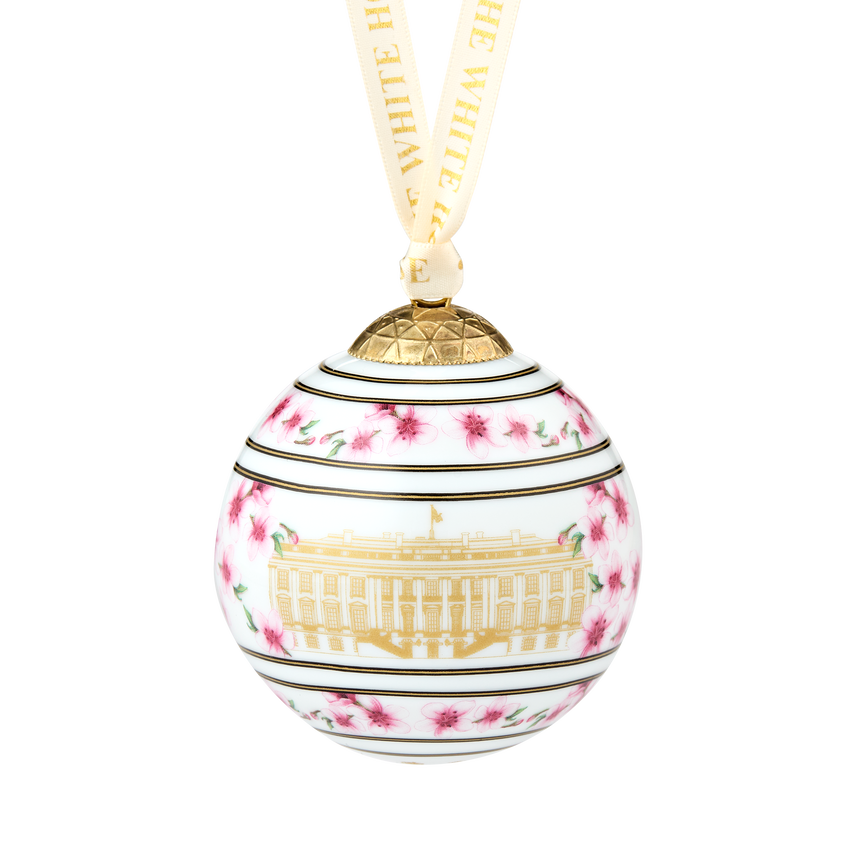 This elegant, English Fine Bone china 3" bauble ornament is handcrafted and beautifully decorated and accented with gold. The bauble depicts both the north and south views of the White House surrounded by impeccably detailed watercolor cherry blossom flowers. This item arrives boxed with gold foil branded imprint, perfect for gifting. Halcyon Days pieces are designed to last, this bauble has been hand-decorated in the UK by their master craftsmen and women. Each bauble showcases the skill of their artisans, based in Stoke-on-Trent, the heart of the English pottery industry.