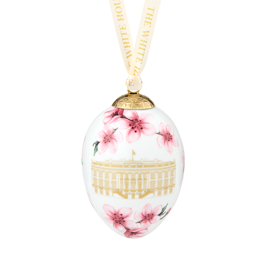 This elegant, handcrafted and beautifully hand decorated English Fine Bone china ornament is accented with a depiction of the south view of the White House surrounded by impeccably detailed watercolor cherry blossom flowers. This item arrives boxed with gold foil branded imprint, perfect for gifting.