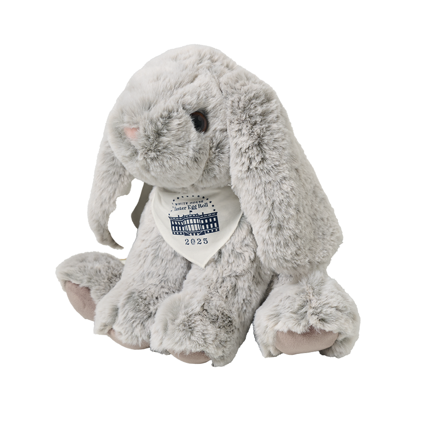 Our Easter Bunny is an ultra-plush bunny adorned with a white banana that depicts the south view of the White House with text that reads "White House Easter Egg Roll 2025". Designed with only the softest plush materials and featuring a floppy body style stuffed with quality polyester fill, the bunny is detailed with a pink, flocked nose and a fluffy tail. The South Lawn Bunny is lifelike in appearance and cuddly softness, a keepsake for years to come. Did you know the rabbit’s emergence as a household pet began when President Abraham Lincoln was in office? Lincoln’s sons had a pet rabbit as did the children of President Theodore Roosevelt and President John F. Kennedy.