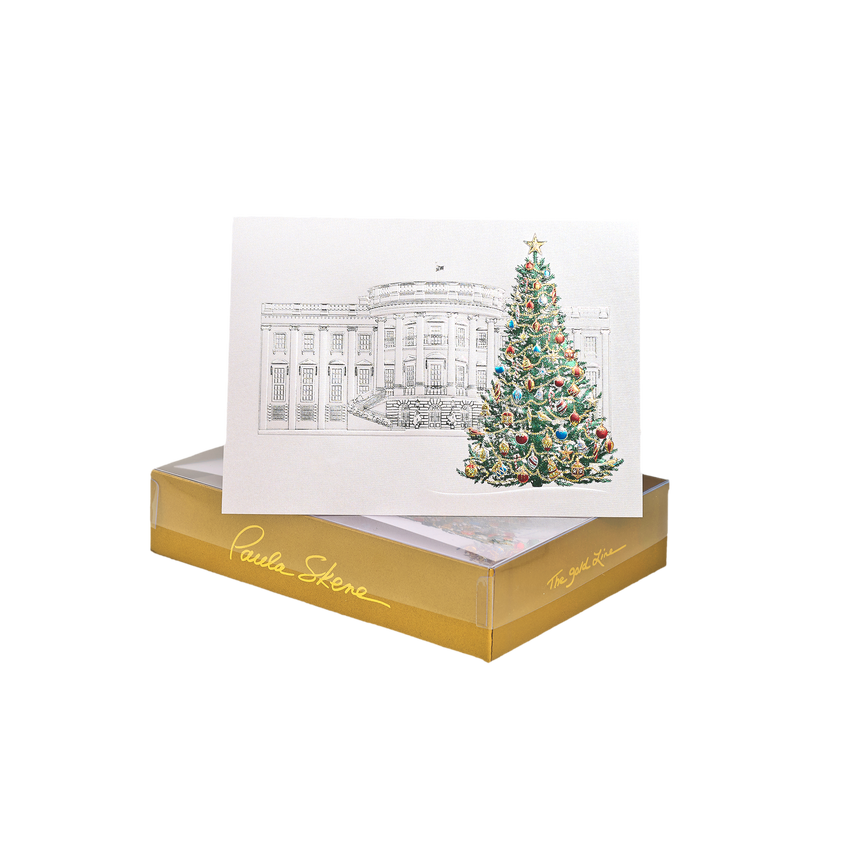 We set out to capture the beauty and elegance of the White House at Christmas and this set of six embossed greeting cards does just that. Presented on a white satin card, a depiction of the South Portico of the White House is embossed in gold with exquisite detail. Also featured, is a festive holiday tree complete with foil embossed ornaments, invoking the pride of our National Christmas Tree which stands tall in the ellipse just south of the White House lawn each year. Each card comes with an envelope. Inside is printed with "season's greetings", the perfect card for everyone on your list this year!