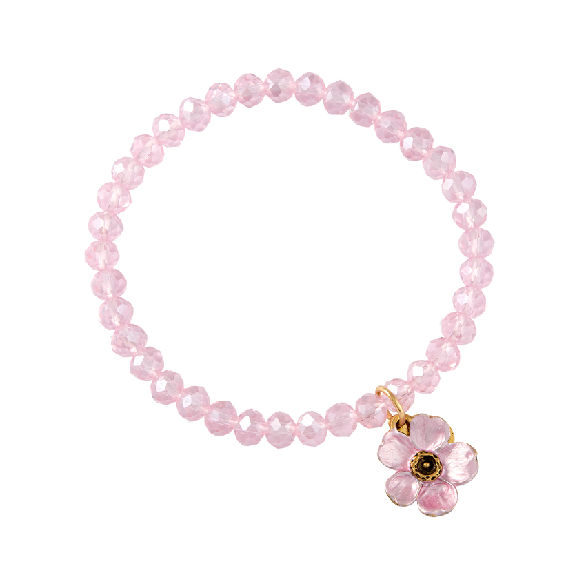 Strut the stackable bracelet trend with this pink crystal elasticated stretch beaded bracelet with pink enameled cherry blossom charm. The bracelet is made in the USA and has a small "made in USA" charm. Wash with mild soap, dry with soft cloth. Choking Hazard. Do not put in mouth. Keep out of the reach of small children.