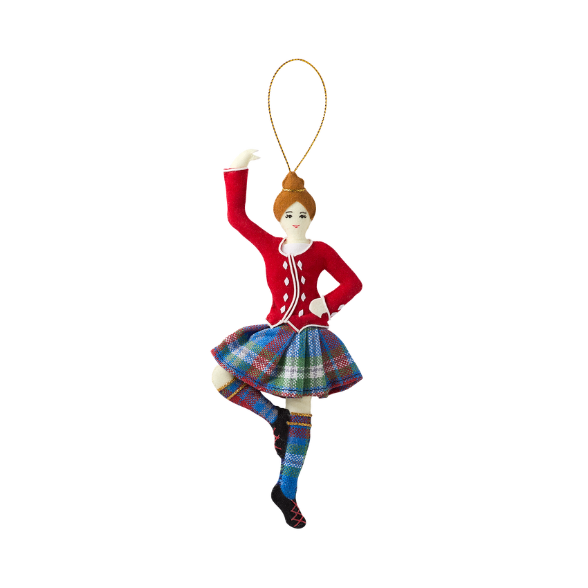 This Highland Dancer is dressed in a traditional Scottish kilt in the official tartan of the White House Historical Association, a tribute to the eight Scottish stonemasons who traveled to Washington in 1794 to embellish the sandstone selected by George Washington for the White House. Thirty-four American presidents have claimed Scottish heritage. The five colors woven into the tartan represent the fundamental colors associated with the architectural fabric of the White House itself. Three colors represent the iconic formal parlors on the State Floor: the Red Room, Green Room, and Blue Room. The gray represents the Aquia sandstone and the artistry of the Scots stonemasons. The white represents the white exterior of the White House, which was first whitewashed by the stonemasons to protect the porous Aquia sandstone. It was later painted white, inspiring the name by which the house is known today.