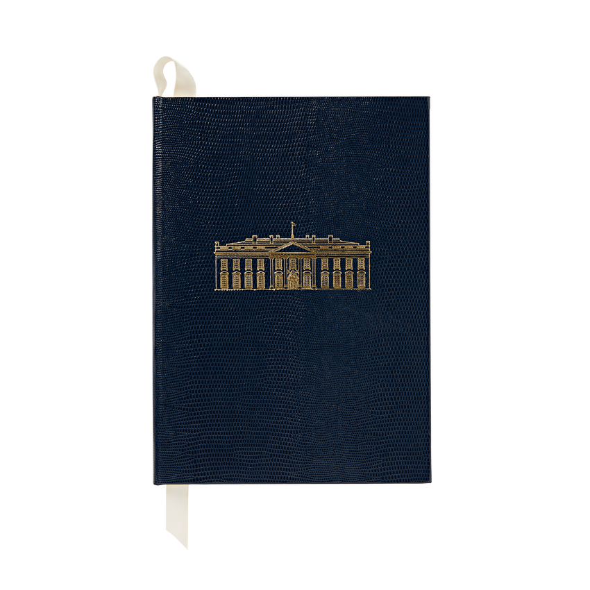 Ideal for the office and any aspiring author, this leather bound notebook is a deep, dark navy. Embossed with the North Portico of the White House in gold.