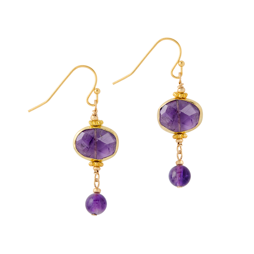 Discover these unique faceted purple amethyst 1 1/2-inch drop earrings with gold accents. Each hand-carved amethyst wedge is encased in vermeil trim on a dainty ear wire. Inherent to the hand carved stone craftsmanship is slight natural variations in color and size. Gold-plated pewter for a touch of casual elegance.