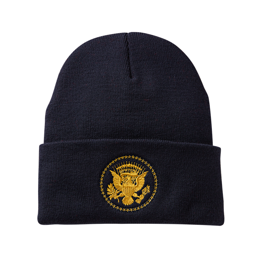 On October 25, 1945 President Harry S. Truman issued Executive Order 9646, which officially defined the Presidential Coat of Arms and Seal for the first time. An eagle’s head, which originally faced right toward a bundle of thirteen arrows held in its talons, was turned to face left toward the olive branch it held, symbolizing peace. Since 1945, the only changes made to the seal were the additions of the 49th and 50th stars. This navy knit beanie features the historic Truman Seal in gold. Unisex. One size fits all.