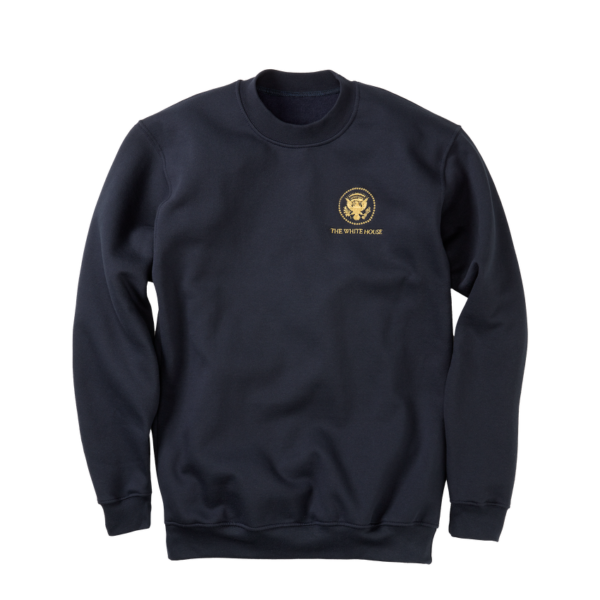 A navy sweatshirt embroidered with Truman Seal and The White House in gold thread.