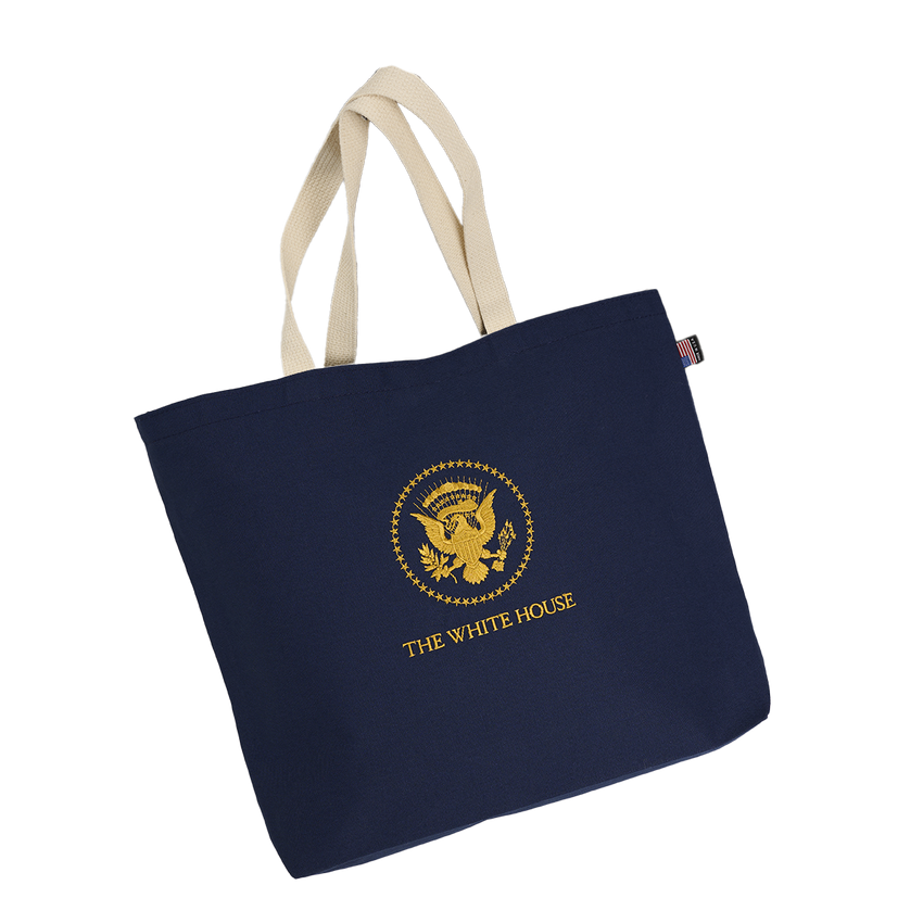 This navy tote is embroidered with the Truman Seal in gold. On October 25, 1945 President Harry S. Truman issued Executive Order 9646, which officially defined the Presidential Coat of Arms and Seal for the first time. An eagle’s head, which originally faced right toward a bundle of thirteen arrows held in its talons, was turned to face left toward the olive branch it held, symbolizing peace. Since 1945, the only changes made to the seal were the additions of the 49th and 50th stars.