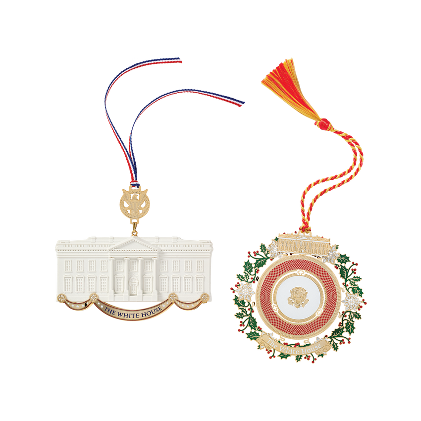 The Official 2025 White House Christmas Ornament celebrates the 150th anniversary of State Dinners at the Executive Mansion. Hand assembled, the ornament design is cut from delicate brass, etched, and printed with enamel ink and finished with 24-karat gold for the ultimate holiday shine.