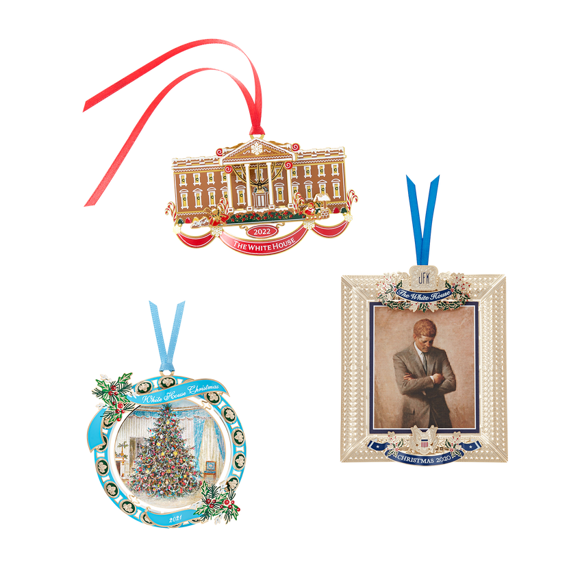 2022 Ornament: The White House Historical Association's Official 2022 White House Christmas Ornament represents the cherished White House tradition of displaying a gingerbread house each holiday in the State Dining Room. A perfect addition to any holiday tree, this American-made holiday ornament illustrates this decades-long tradition, complete with delicate icing, red and white striped candies, gumdrops, and candy canes. If you look closely, you can even see little gingerbread children frolicking in front of the North Portico. Included with this beautifully gift-boxed keepsake is a gingerbread scented insert, booklet, and recipe card featuring a gingerbread recipe from First Lady Pat Nixon's time at the White House.