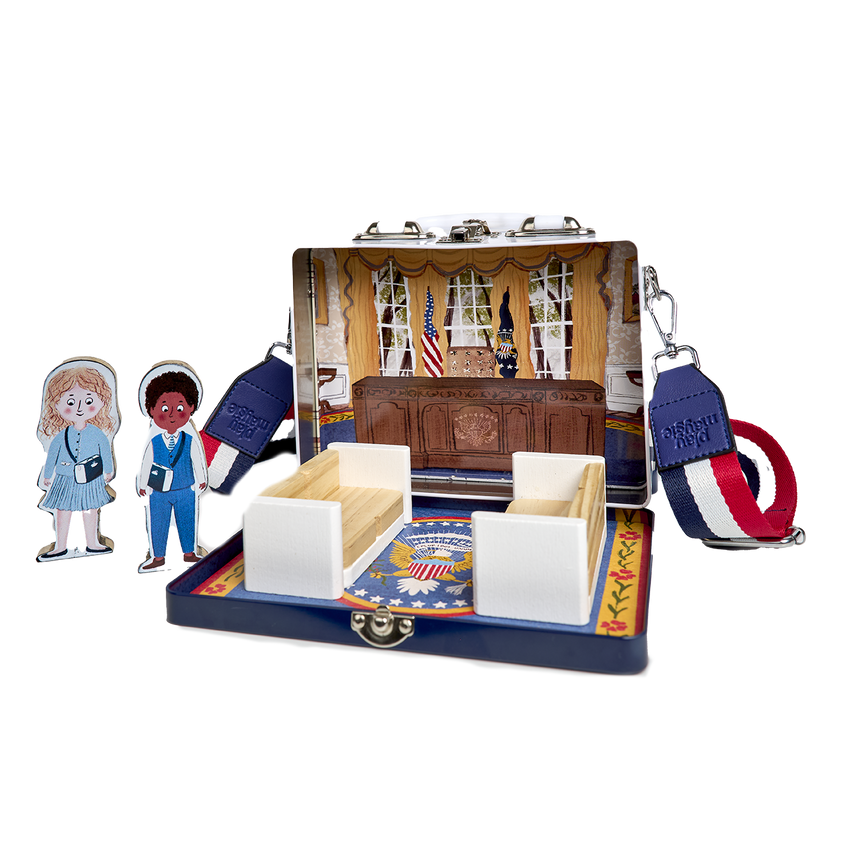 Always remember the wonder of visiting the White House with this exclusive play set from Play Maysie. Created to commemorate the opening of The People's House: A White House Experience, our first fully curated and digital museum experience, The Play Maysie White House Play Case is an instant classic for all ages. From kids that love to play on the go, to nostalgic adults that love the retro look of vintage lunchbox toys, this play case is sure to bring joy to the whole family. This play case opens on both sides to reveal two of the most important rooms in the White House.