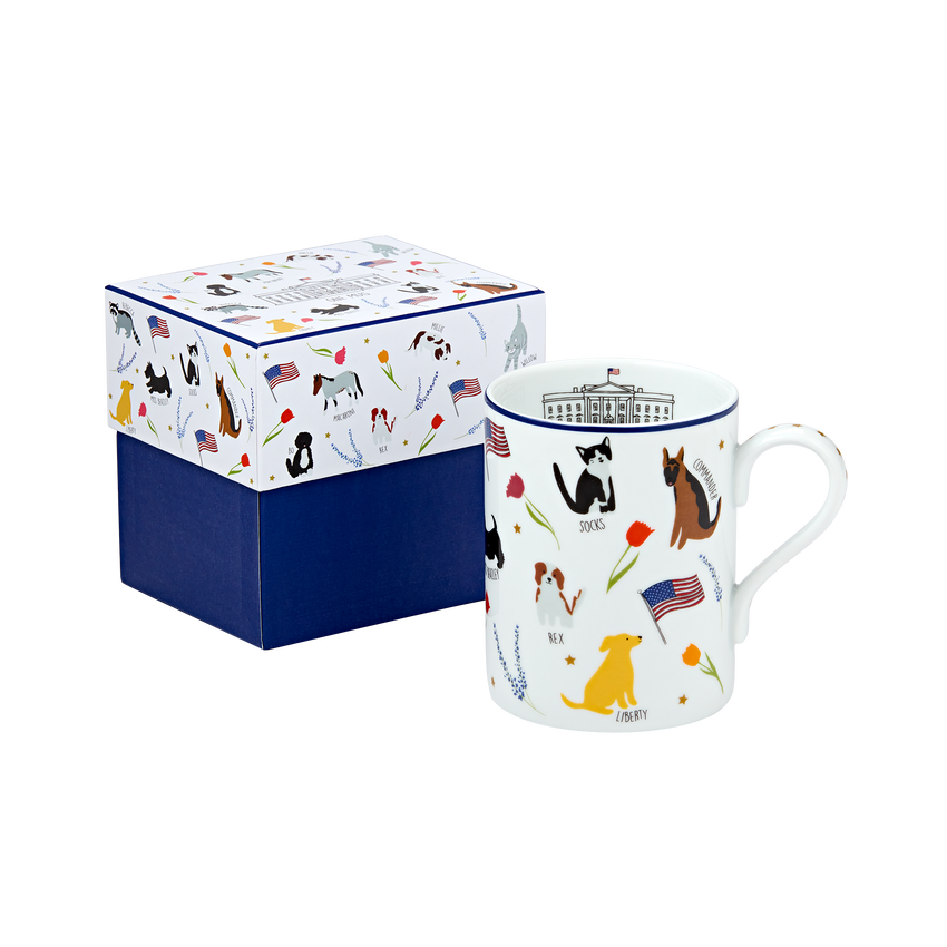 From ponies and puppies to cats and mice, first families have welcomed many different pets into the White House. Our sturdy ceramic mug features whimsical illustrations of many of these pets, including Macaroni, Caroline Kennedy’s pet pony; Socks, a stray cat adopted by Chelsea Clinton; and Millie, President and Mrs. George H.W. Bush’s English Springer Spaniel.