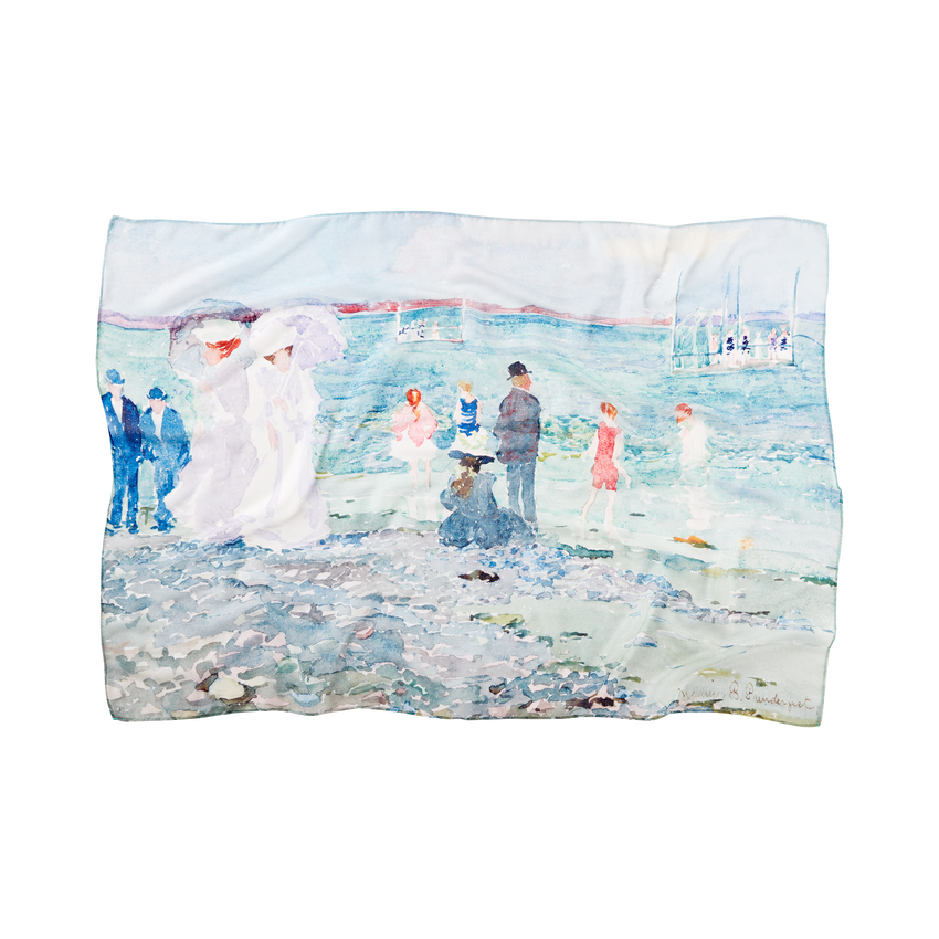 This beautiful scarf depicts the painting Revere Beach by Maurice Pendergast (1896). This watercolor landscape of Revere Beach in Revere, Massachusetts by Maurice Pendergast was completed around 1896-1897. Pendergast captures a sunny day at the beach with swimmers, walkers, and sun-bathers out enjoying a leisurely day. He was a Canadian-born painter who is known as a Post-Impressionist. He has two paintings in the White House Collection.