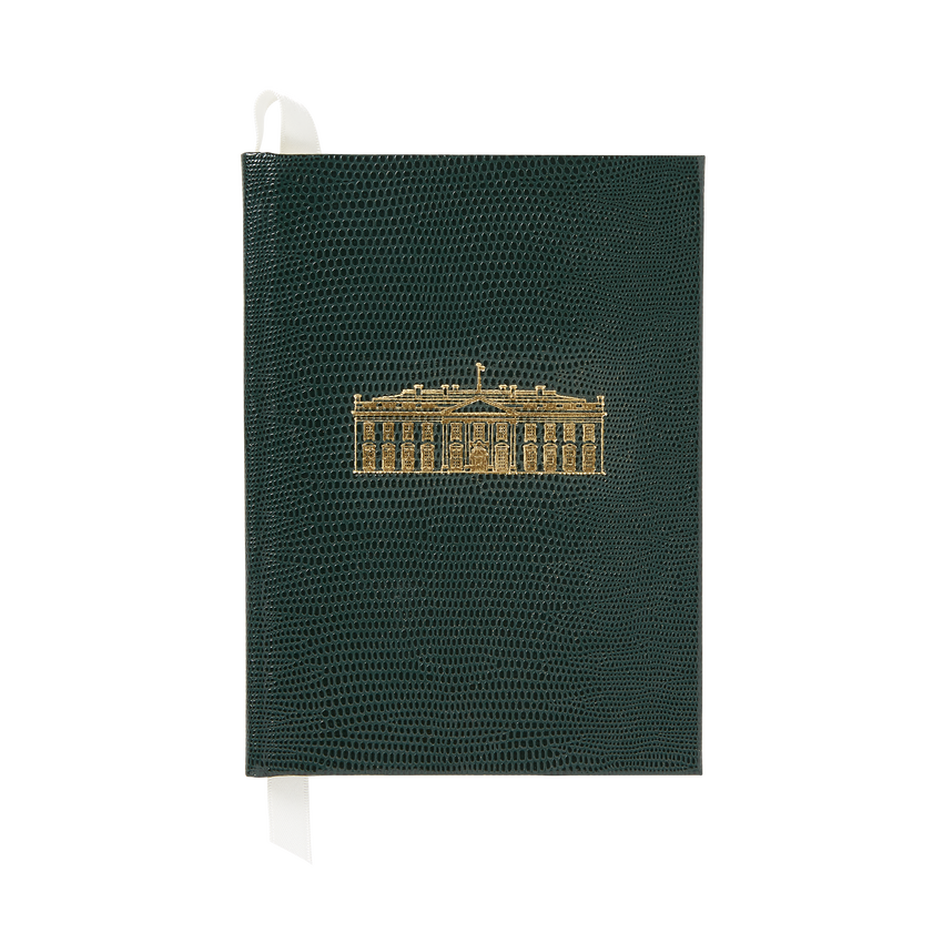 Ideal for the the office and any aspiring author, this leather bound notebook is a rich emerald green. Embossed with the North Portico of the White House in gold.