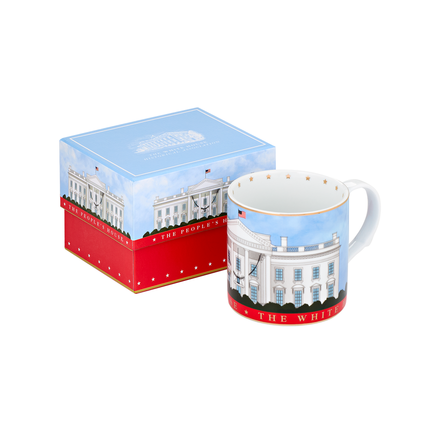 Made of smooth and high quality porcelain, this elegant 12 ounce. mug features a watercolor illustration of The White House. Adorned with gold foil details along the rim and handle, it reads "THE PEOPLE'S HOUSE. THE WHITE HOUSE." along the base of the mug in foil lettering. Mug comes in a giftable, decorative box. Not microwave safe. Handwash recommended.
