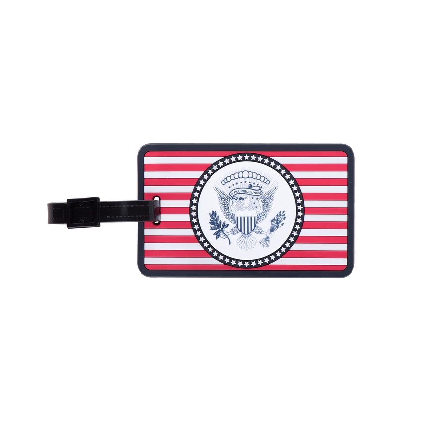 This durable luggage tag is made of PVC and depicts the Truman Seal with red stripes in the background.