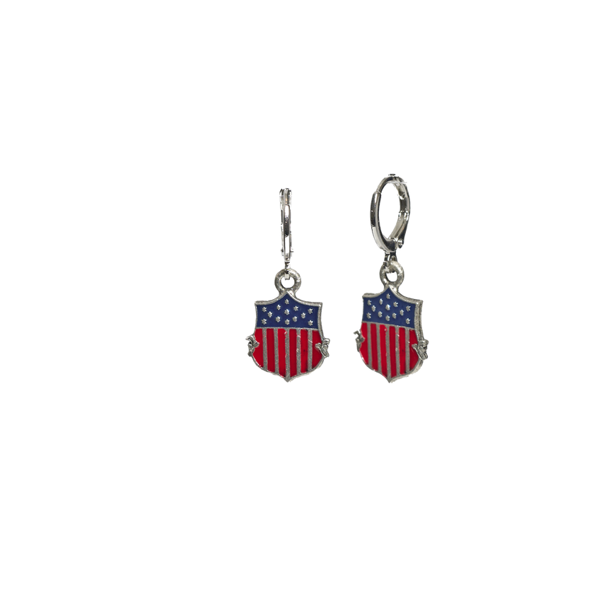 These earrings are the perfect accent to your patriotic attire year-round. A gold mirror hangs above the fireplace in the recently renovated Lincoln Bedroom of the White House. The detail on these earrings is a replica of that Union Shield motif on the mirror's gilded crest. Huggie Ear is Platinum-Plated Brass and Shield is Sterling Silver-Plated Pewter w/Enamel Inlay. Choking hazard, small pieces. Keep out of reach of children.