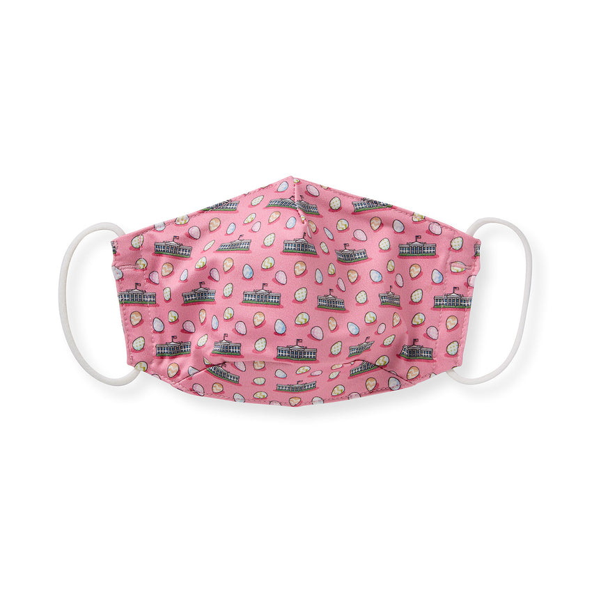 Keep the whole family safe during Easter with our pair of children sized Vineyard Vines masks. This pink mask is imprinted with colorful easter eggs and the facade of the White House. These masks are one size.