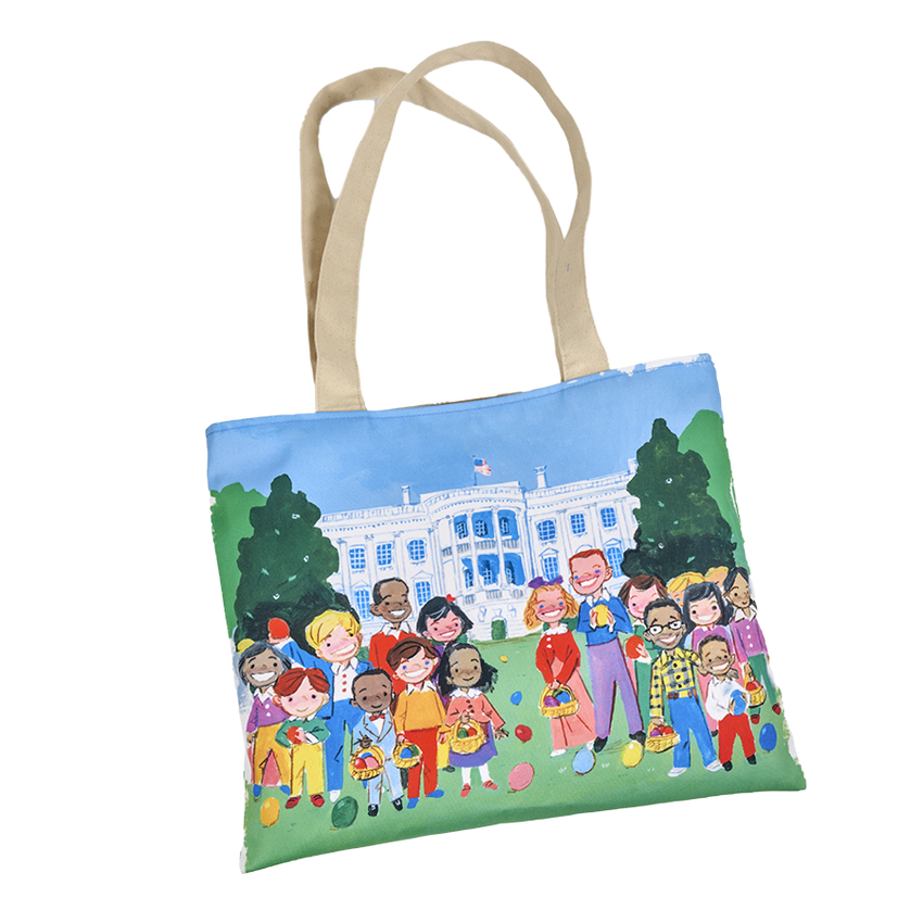 This Made in USA, cotton printed tote captures the fun of the Annual White House Easter Egg Roll. The image is taken from one of our very own White House Historical Association children’s books, “Rocco at the White House Easter Roll!”, which was written by elementary school student Rocco Smirne, and illustrated by John Hutton, a professor of art history at Salem College.