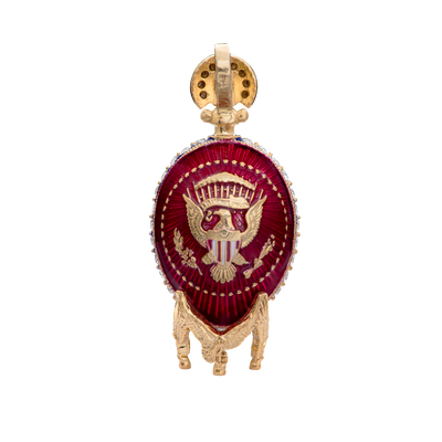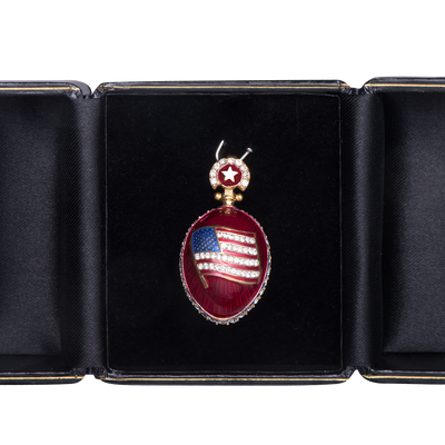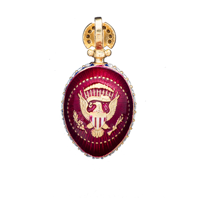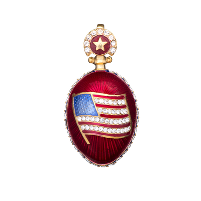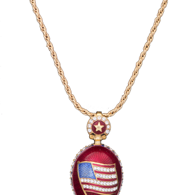 This patriotic egg pendant is carefully handcrafted by master jewelers from sterling silver cores, Swarovski crystals, deep red enamels, and 24-karat gold vermeil. Each egg comes with a 24-karat gold vermeil stand. Limited quantities available.