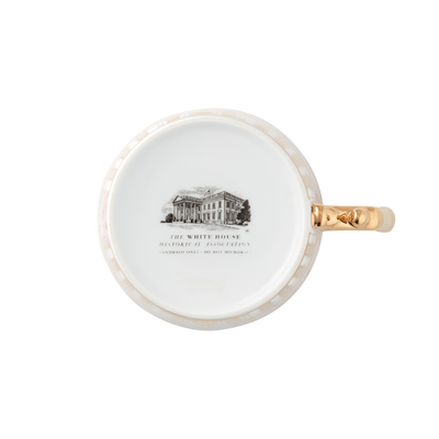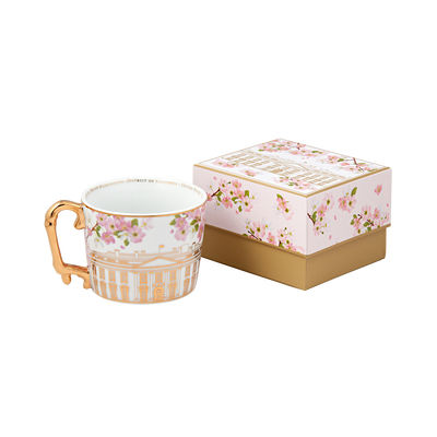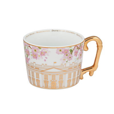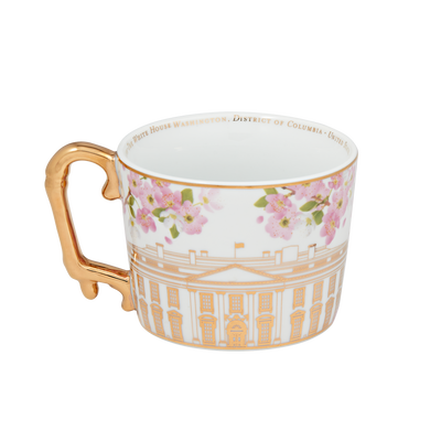 It was First Lady Helen Herron Taft's idea to plant the cherry trees along the Tidal Basin and her wish was realized in 1912 when 3,000 trees were given to the United States by Japan. Now more than 100 years old, the mature cherry trees with their spectacular springtime blossoms are celebrated annually with a festival and parade in Washington D.C. This porcelain mug features the White House surrounded by cherry blossom branches in full bloom. The handle and base feature beautiful gold detailing and it holds 12 ounces of liquid. Hand-wash only. Do not microwave.