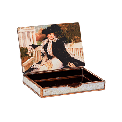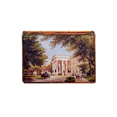 The exterior of this glass decoupage box depicts a painting by artist John Ross Key. Key painted this image of the north side of the White House in 1914. Key, the grandson of Francis Scott Key, captured the bustling activity of carriages and pedestrians on the approach to the North Portico of the President's House on a bright summer day. Today the painting hangs in Blair House: The President's Guest House, just across Pennsylvania Avenue from the scene Key captured. On the interior is the Official White House portrait of First Lady Edith Roosevelt, painted by Theobald Chartran in 1902. Mrs. Roosevelt is elegantly dressed complete with hat and gloves, taking in nature on a bench on the South Lawn of the White House.