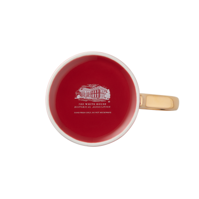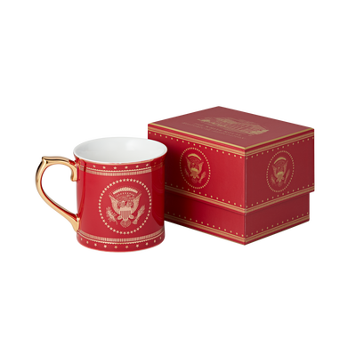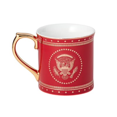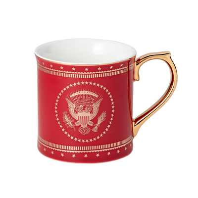 This stately red porcelain mug is adorned with the historic Truman Seal in gold. On October 25, 1945 President Harry S. Truman issued Executive Order 9646, which officially defined the Presidential Coat of Arms and Seal for the first time. An eagle’s head, which originally faced right toward a bundle of thirteen arrows held in its talons, was turned to face left toward the olive branch it held, symbolizing peace. Since 1945, the only changes made to the seal were the additions of the 49th and 50th stars. The mug holds 12 ounces of liquid. Hand-wash only. Do not microwave.