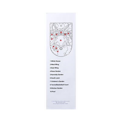President's Park in Washington, D.C., is a historic area that encompasses the White House and its surrounding ground, including Lafayette Square to the north and The Ellipse to the south. This Made in USA bookmark highlights key elements of the property as an illustrated map, with a key to certain locations included on the back of the insert card. Made from lightweight brass, this bookmark is the perfect companion to learning White House history through one of many of The White House Historical Association's outstanding publications. Includes tassel to hold your place and comes in a protective sleeve with descriptive insert card.